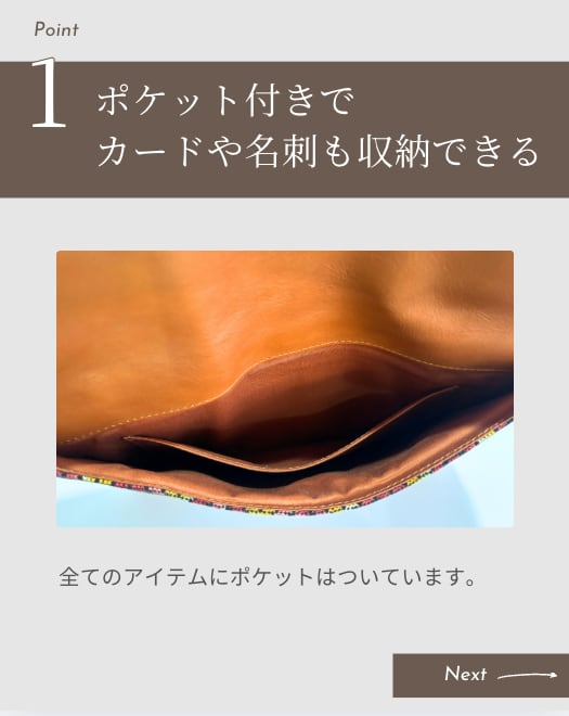 ◎便利なポケット付きで、ペンや名刺などが収納可能