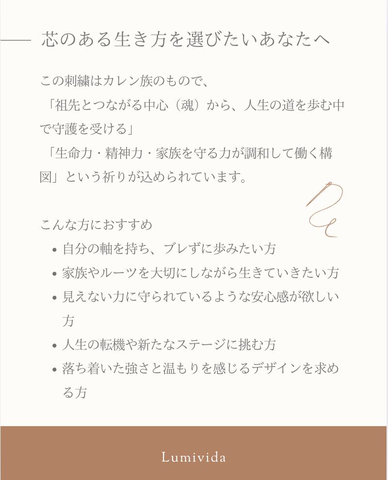Lumividaでは全ての刺繍や縫製にエシカルな視点を大切にし、職人の技術と情熱が込められています。特別なアイテムをあなたにお届けします。