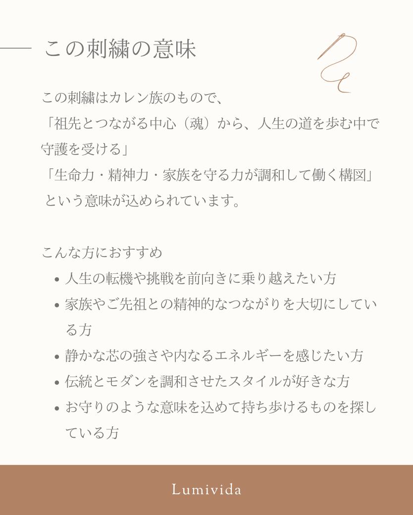 Lumividaでは全ての刺繍や縫製にエシカルな視点を大切にし、職人の技術と情熱が込められています。特別なアイテムをあなたにお届けします。