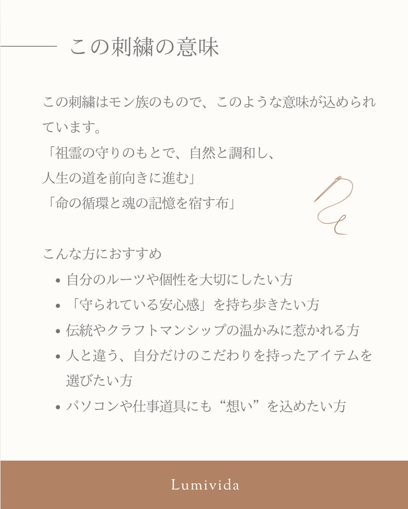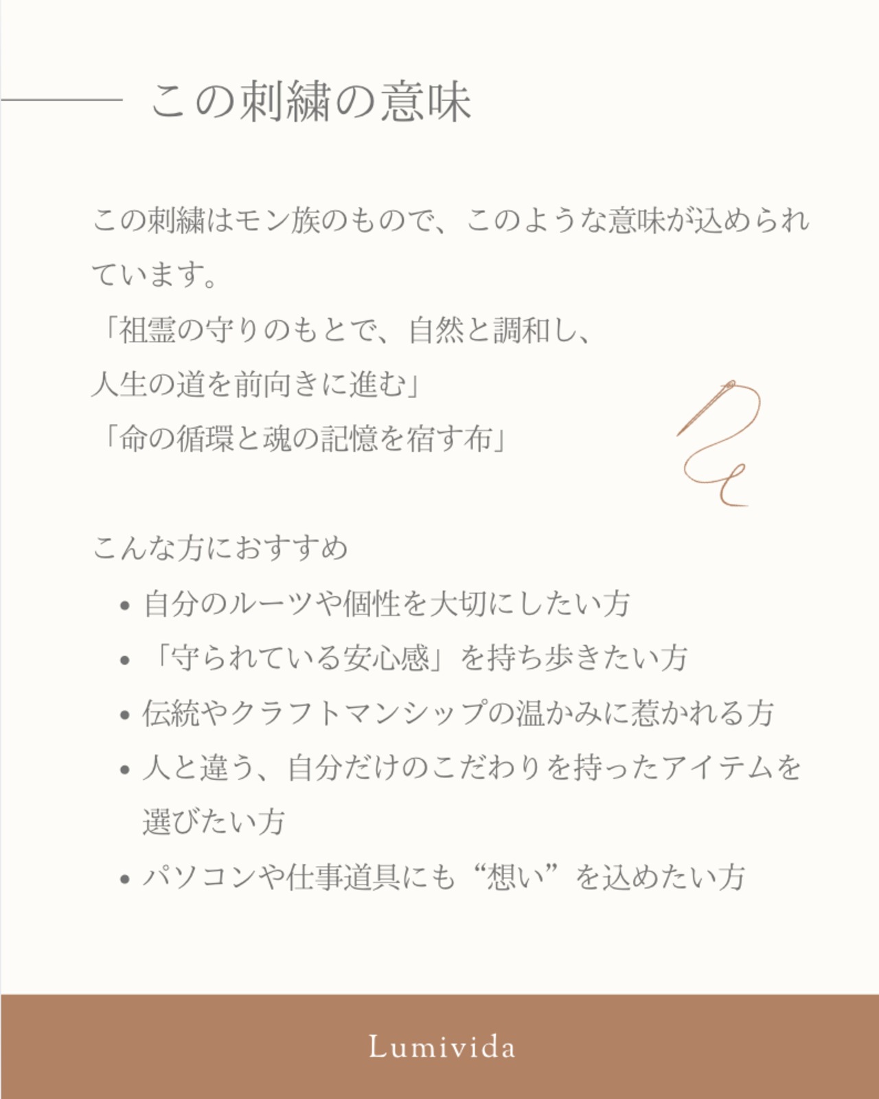 Lumividaでは全ての刺繍や縫製にエシカルな視点を大切にし、職人の技術と情熱が込められています。特別なアイテムをあなたにお届けします。