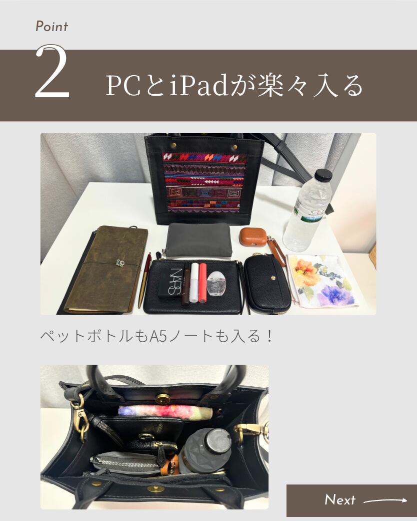 さらにペットボトルがすっぽり入る大容量で、美しいバッグです。